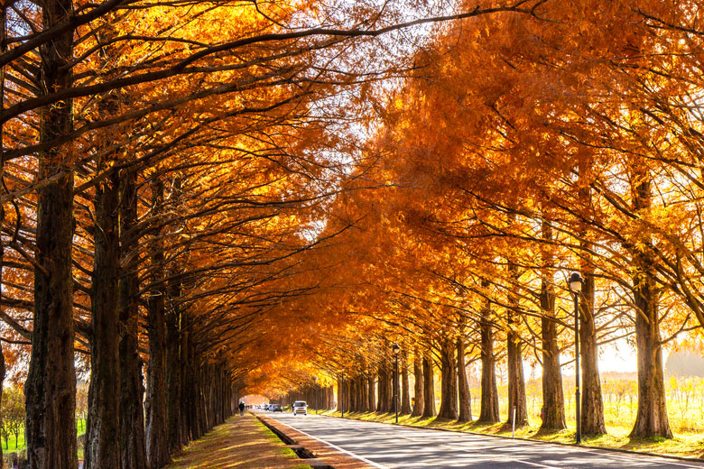 滋賀県高島市・マキノ高原のシンボル「メタセコイア並木」は、農業公園マキノピックランドを縦貫する県道沿いに、約500本が延長2.4kmにわたり立ち並ぶ圧巻の景観です。